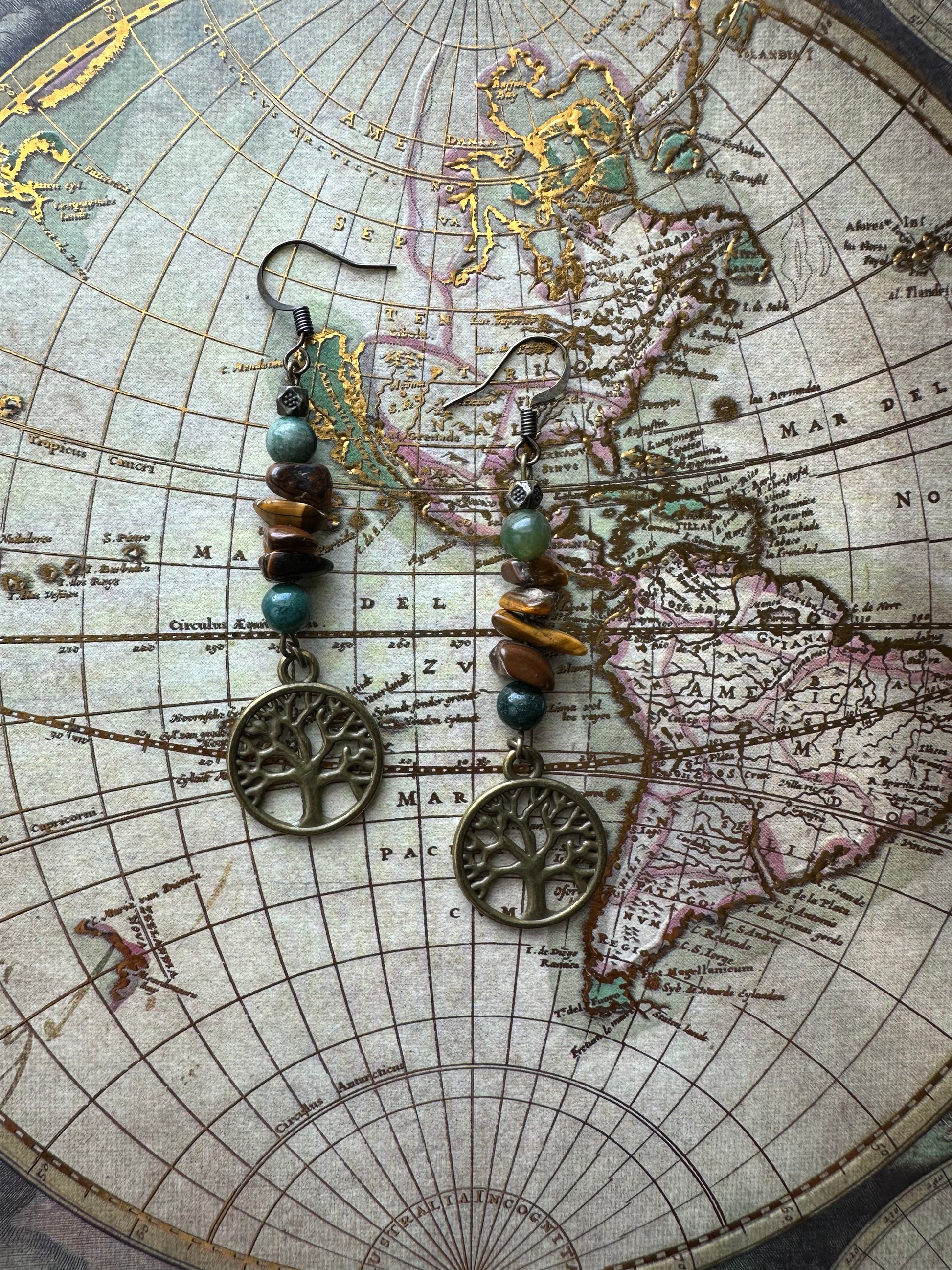 These earrings are made with indian agate, tiger eye chip beads, 1 bronze spacer bead on each, a bronze tree of life charm and hypoallergenic antique bronze earring hooks with a rubber backing. From top to bottom they hang approx. 3 inches long. Earring care ; avoid getting them wet and prolonged sun exposure. This listing is for one pair of crystal dangle earrings.