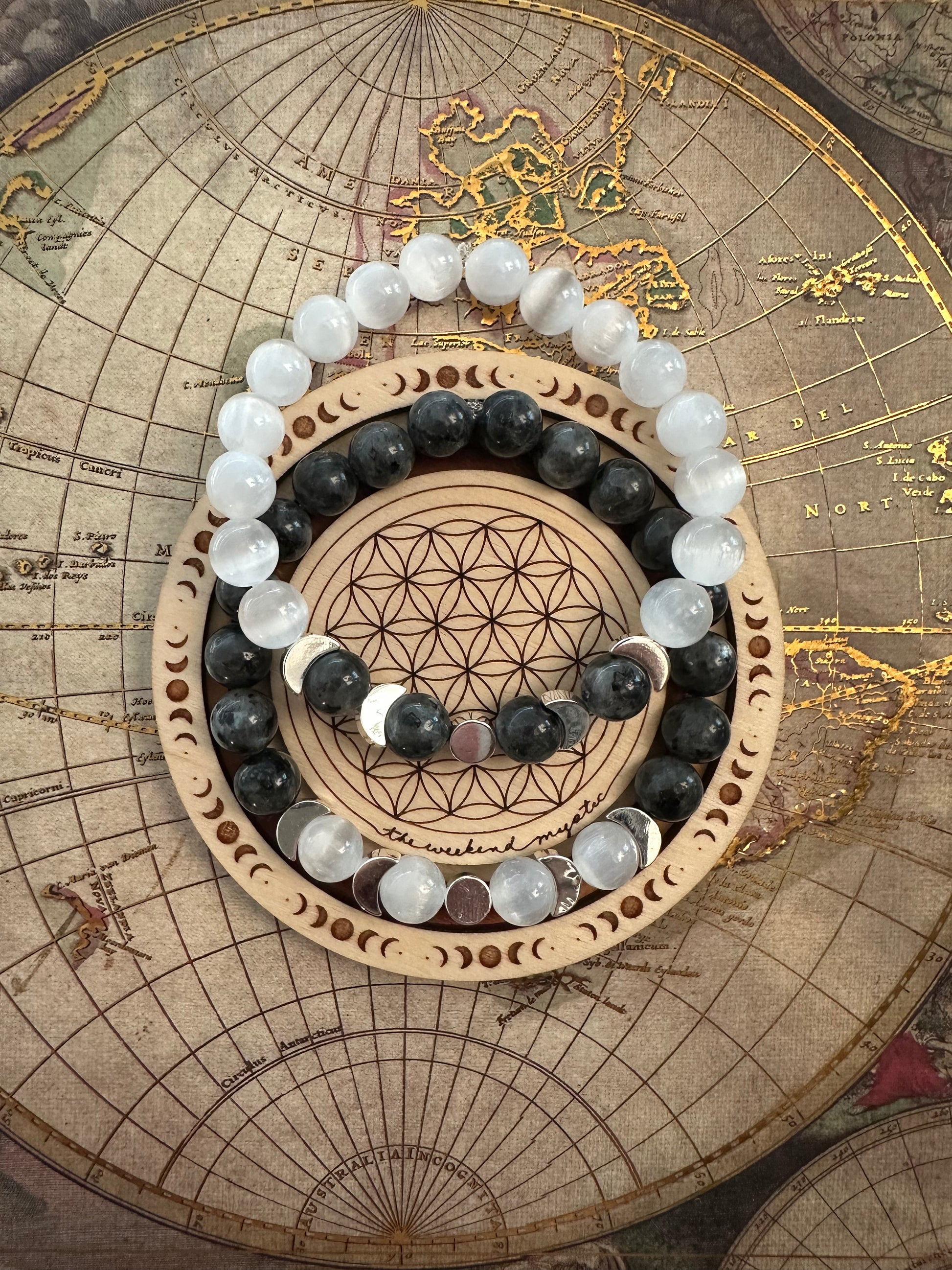 This bracelet is made with brass moon phase beads as the focal with selenite and black labradorite beads surrounding. 2 options, same beads on both bracelets. This bracelet is 7 inches and will fit a 6-7 inch wrist. Bracelet care ; avoid getting it wet and prolonged sun exposure. This listing price is for one moon phase stretch bracelet.