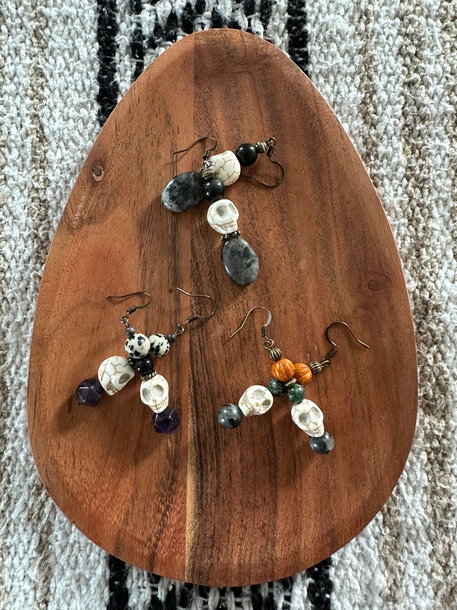 Spooky Skull #2: These earrings are made with chunky amethyst, skull beads, black agate, dalmatian jasper, amazonite and bronze spacer beads.